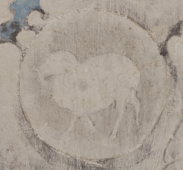 A gentle yet powerful ram with curling horns of gold stands proud in a Tang pyramid-roofed cave. Its white fleece is rendered in raised gypsum, catching light like fresh snow on the Gobi. Surrounding mandalas pulse with energy; the ram charges forward eternally, embodying the explosive rebirth of spring after the longest desert winter.