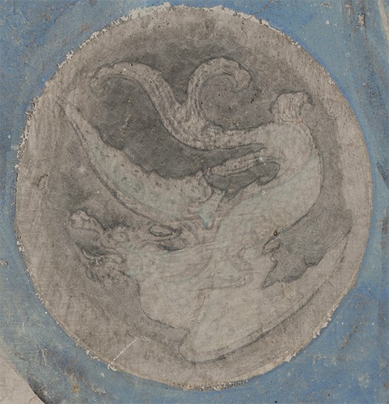 In the twilight of Western Xia, two carp swim eternally toward enlightenment in the Yulin Grottoes. Their scales are painted in thick malachite and azurite, bodies entwined with lotus stems — rebirth in every brushstroke. Above them, the vault rises like an inverted sky of lapis lazuli; the fish never reach nirvana, yet they never tire, carrying the hopes of all sentient beings through endless kalpas.