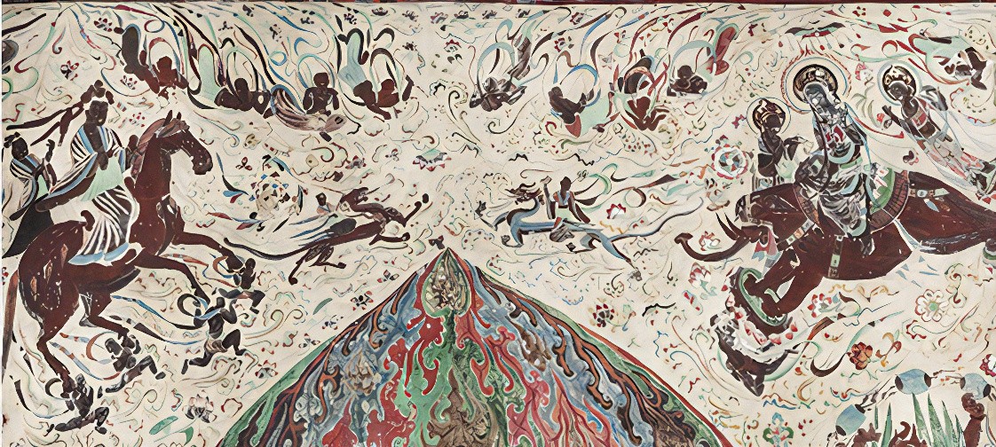 One of the oldest painted ceilings in Mogao. Celestial dancers and donors whirl among lotus blossoms beneath an indigo sky. The first breathtaking fusion of Central Asian shadows and Chinese lines.One of the oldest painted ceilings in Mogao. Celestial dancers and donors whirl among lotus blossoms beneath an indigo sky. The first breathtaking fusion of Central Asian shadows and Chinese lines.